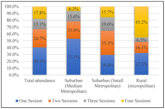 Figure 1 illustrates patterns of attendance across locations. A total of 59 out of 146 (40.4%) participants attended one session across all the locations. A total of 39 out of 146 (26.7%) participants attended two sessions. A total of 22 out of 146 (15.1%) participants attended a total of three sessions. A total of 26 out of 146 (17.8%) participants attended all four sessions. The rural micropolitan senior center had the largest proportion of participants who attended all four sessions (45.2%), compared to the suburban small metropolitan continuing care community where 15.7% attended four sessions, and the suburban medium metropolitan senior center where only 6.3% attended all four sessions. The largest community had the highest proportion of participants who attended just one session (53.1%).