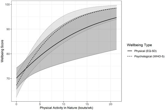 The association between the predictor variable, Physical Activity in Nature, and the outcome variables, mean Physical (EQ-5D) and Psychological (WHO-5) Wellbeing scores, estimated from the GLMEM model. The grey areas designate the 95% confidence bands.