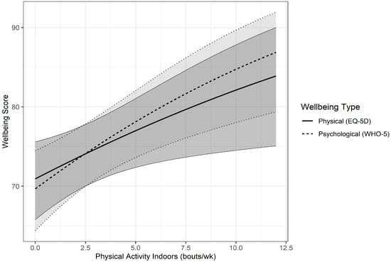 The association between the predictor variable, Physical Activity Indoors, and outcome variables, mean Physical (EQ-5D) and Psychological (WHO-5) Wellbeing scores, estimated from the GLMEM model. The grey areas designate the 95% confidence bands.