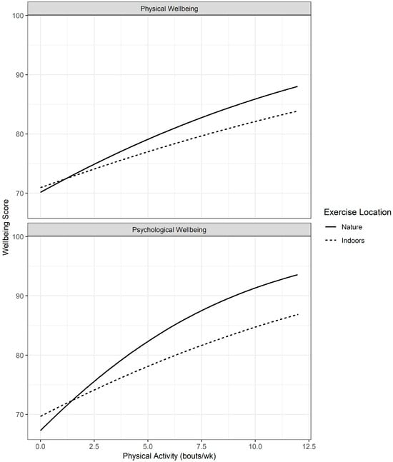 In the present study, a stronger positive association between frequency of PA in nature and reported psychological wellbeing than with physical wellbeing was observed. Support for this finding can be found in a systematic review of 25 studies of health effects of activities in natural versus “synthetic” man-made environments [53]. In their systematic review, there was stronger evidence for improved emotional wellbeing with natural environment exposure than for physiological wellbeing as in our findings. It should be noted that the studies reviewed varied widely, and activities ranged from light gardening to strenuous exercise. In the present study, there was a measure of frequency (of bouts >20 min) but not duration nor intensity, and thus, load was not quantified. Since load (volume x intensity) is the primary determinant of the physiological response and adaptation, it may be that the reduced strength of association between physical wellbeing and PA in nature may be due to this source of variability.