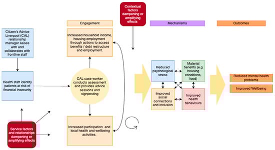 A range of small-scale studies have reported that welfare support interventions do improve financial security, with the monetary benefits being greater than the cost-of-service provision [24,25,26]. Many of these studies have reported improved mental health and reduced stress-related conditions for service users, although the quantitative impact of these mental-health- or wellbeing-related changes on the cost effectiveness of services has not been reported. Social prescribing interventions have also been linked to improvements in anxiety levels, wellbeing, and quality of life, with these changes reported to be cost-effective [27] and linked to reductions in healthcare use [22].