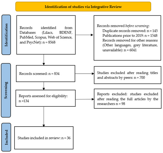 An exploratory, descriptive, and integrative literature review study was conducted, as adapted from PRISMA guidelines, following research stages [30,31,32,33]: Firstly, composition of the research question based on the PICo strategy. Secondly, definition of inclusion and exclusion criteria. Thirdly, selection of health sciences descriptors (DeCS) and medical subject headings (MeSH) and their respective synonyms. Fourthly, composition of the electronic search expression and its insertion into national and international databases. Finally, synthesis of the selected references.