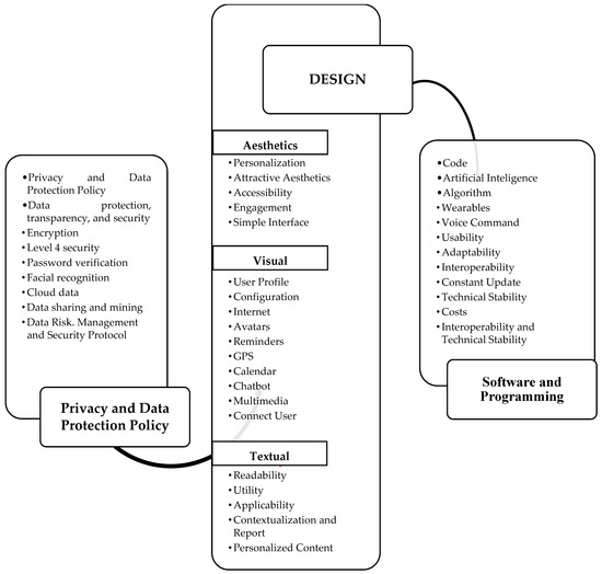 The design needs to be user-centered and have content and technological resources that unfold into images, icons, and texts [46,56], buttons, and menus that meet their functionality and are based on theoretical support and/or scientific evidence [12,40,46], with the inclusion of colorful icons and appropriate screen sizes, a pleasant modern aesthetic, and needs to avoid cognitive overload [25,35,46,54,56].