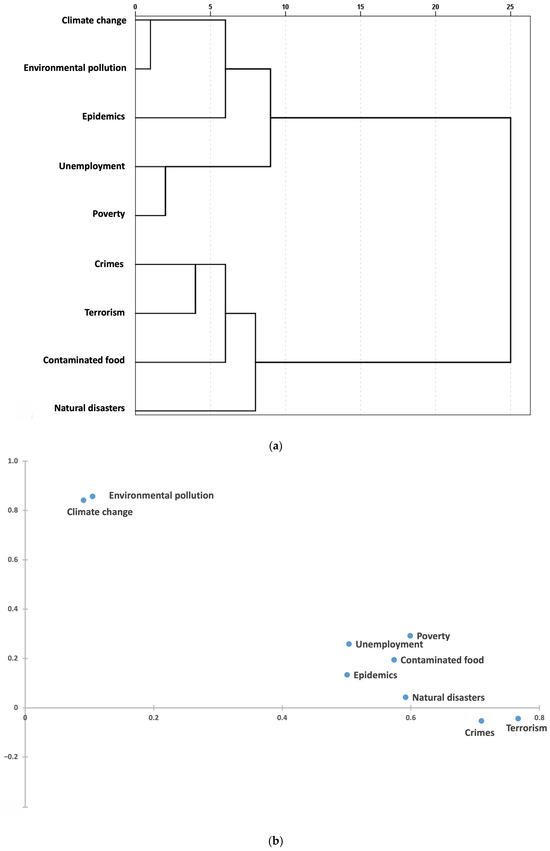 (a). Upper figure: Dendrogram of the perceived risk variables (Hierarchical Cluster Analysis). (b). Lower figure: Biplot (after Varimax rotation) of the perceived risk variables (Multiple Correspondence Analysis).