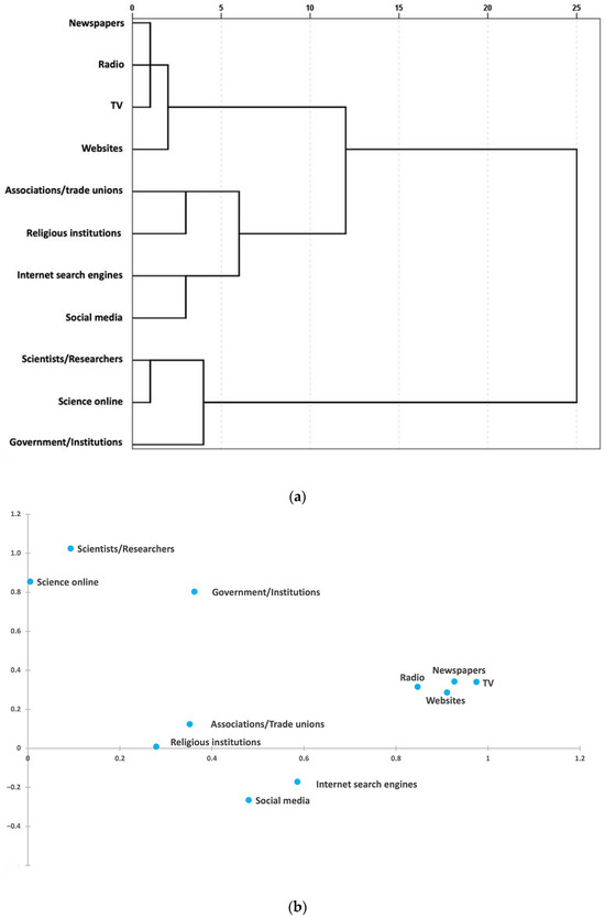 Regarding sources of information and trust, five new variables were derived: scientists and researchers/science online, associations and trade unions/religious institutions, internet search engines/social media, TV/radio/newspapers/traditional media websites, and the last one consisting of government and institutions (Figure 2a,b, Table 3).