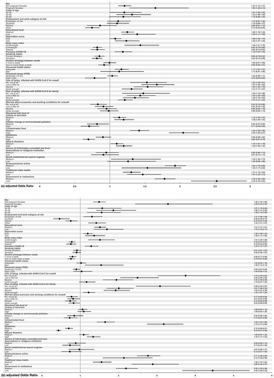 (a). Upper figure: Forest plot—propensity to SARS-CoV-2 vaccination and vaccine hesitancy—Multivariable analysis—probably yes; (b). Lower figure: Forest plot—propensity to SARS-CoV-2 vaccination and vaccine hesitancy—Multivariable analysis—no or probably no.