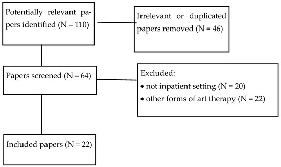 A search of the literature was conducted in December 2024 on the Medline and Pubmed databases to identify articles that explored the efficacy of active visual art therapy in hospital settings with the following keywords: visual art therapy; general hospital; inpatients; ethics; psychosocial outcomes; autonomy; beneficence; non-maleficence; and justice. These keywords were used as alternatives (i.e., connected with the logical operator “OR”) in order to reduce the risk of missing relevant papers. Two authors (V.M. and E.L.) independently screened articles by title and abstract to identify relevant papers. The inclusion criteria were: considering the use of AVAT in inpatient settings; having been published between 2004 and 2024; and being written in English or Italian or French. The exclusion criteria were: considering other forms of art therapy (not including AVAT); reporting data regarding outpatients or community samples; and failing to meet inclusion criteria. The selected papers were critically revised, and any disagreement was solved through discussion with two other authors (L.F.P. and M.C.) to reach a consensus. The selection process followed the PRISMA model [13], as shown in Figure 1.
