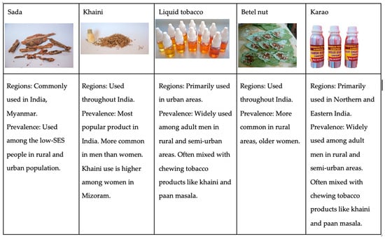 Smoked tobacco is the most commonly recognized form of tobacco use. However, smokeless tobacco also has significant health implications, particularly in regions where these products are culturally ingrained. India, in particular, has one of the highest rates of smokeless tobacco use, with 185.8 million users, representing 68% of all users worldwide [3]. Some of the most widely used products include khaini (sun-dried tobacco mixed with lime), gutkha (a mix of crushed areca nut, tobacco, and other ingredients), and betel nut (also known as “paan with tobacco”) [4]. The products are deeply embedded in social and cultural traditions, making it challenging to reduce their use despite growing awareness of the health risks. The northeastern region of India stands out as a high-burden area for both smoked and smokeless tobacco use. It also has one of the highest prevalences of tobacco consumption, particularly among men and those employed in labor-intensive occupations [5,6].