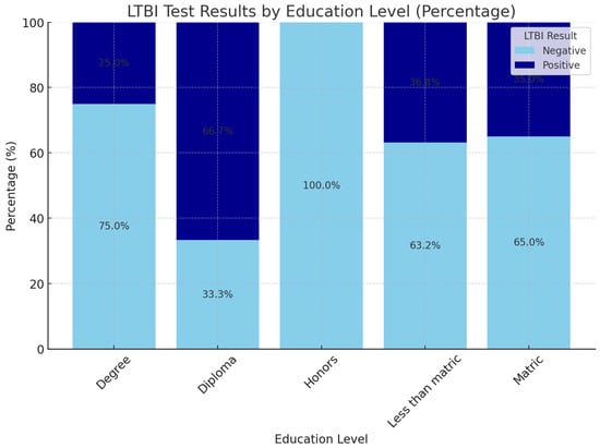 Figure 5 compares Q1 responses across different education levels, providing insights into how educational background may influence participants’ views or knowledge related to the question posed in Q1. The analysis reveals that LTBI positivity rates vary by educational attainment, with higher rates among individuals with a Diploma (66.7%) and those with less than a Matric qualification (36.8%), suggesting that lower or vocational education levels may correlate with increased LTBI positivity. Individuals with Honors degrees show exclusively negative results in this sample, although this group has a small sample size, limiting generalizability. Degree holders and those with Matric qualifications present more balanced distributions, with positivity rates of 25% and 35%, respectively. These patterns indicate a potential trend where vocational diploma holders, at 66.7% positivity, represent the group with the highest LTBI positivity, followed by those with less than Matric and Matric qualifications, around 35–37% positivity. Degree holders show 25% positivity, while all Honors degree holders are negative for LTBI, though the latter group is smaller.