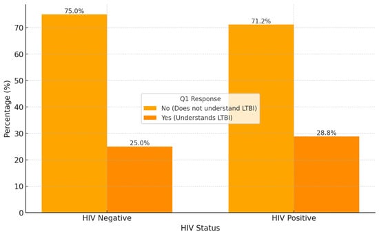 Figure 6 illustrates the percentage of individuals’ understanding of the LTBI term, categorized by HIV status. In the HIV-negative group, 75.0% do not understand the LTBI term, while only 25.0% demonstrate an understanding, indicating a significant knowledge gap in LTBI awareness within this population. In comparison, within the HIV-positive group, 71.2% do not understand LTBI, and 28.8% show an understanding. Although the level of understanding is slightly higher among HIV-positive individuals compared to HIV-negative ones, a substantial portion in both groups still lacks adequate LTBI knowledge.