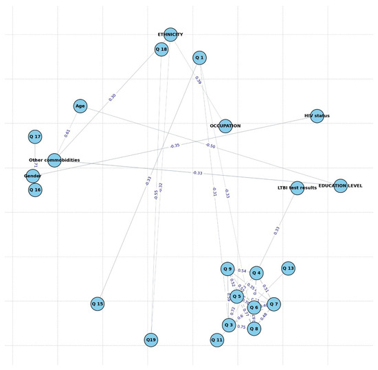 In Figure 9, the network analysis reveals important structural connections among variables, with nodes representing variables and edges (connections) indicating significant correlations (|correlation| > 0.3). The analysis reveals several significant correlations between demographic and survey variables within the LTBI study sample. There is a strong positive correlation of 0.50 between occupation and education Level, indicating that specific education levels may align with particular occupations, likely reflecting socioeconomic or career-related trends. Occupation also has a correlation of 0.35 with ethnicity, suggesting occupational roles vary across ethnic groups, potentially due to occupational segregation or cultural differences in employment trends. Gender and HIV status are correlated at 0.33, implying gender differences in HIV prevalence or diagnosis, possibly reflecting health disparities or risk factors by gender. Gender and education level have a negative correlation of −0.33, suggesting gender-based differences in educational attainment, where higher education levels may be less prevalent in one gender. Age correlates with education level at 0.32, indicating that educational attainment varies across age groups, with older individuals possibly having different levels of education than younger ones. Age is also correlated with other comorbidities at 0.61, highlighting that older individuals tend to have a higher prevalence of comorbid conditions, as is common with age-related health risks. Ethnicity and comorbidities have a negative correlation of −0.35, suggesting that certain ethnic groups may have different rates of comorbidities, with some groups potentially experiencing lower comorbidity burdens. Education level shows a correlation of −0.33 with LTBI test results, indicating that higher education might be associated with different risk or awareness levels related to LTBI. Among survey questions, Q8 and Q7 display a strong positive correlation of 0.75, suggesting these responses are closely related, likely reflecting similar constructs related to LTBI behaviors, knowledge, or attitudes. Similarly, Q9 and Q4 have a correlation of 0.54, implying that these items may capture related perceptions or knowledge that influence LTBI risk. The visualization of these interrelationships demonstrates the complex interplay of social, demographic, and health factors in shaping LTBI risk. These findings support the need for a holistic approach to LTBI management, integrating targeted health education, socioeconomic support, and tailored screening programs to address disparities and reduce the prevalence of LTBI.