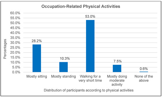Figure 1 depicts the distribution of participants’ occupation-related physical activities. It shows the percentage of participants engaging in different physical activities related to their occupation. The majority (53.0%) reported “walking for a very short time”, followed by 28.2% who spend their time “mostly sitting” and 10.3% who are “mostly standing”. A smaller proportion (7.5%) reported “mostly doing moderate activity”, while a very small percentage (0.6%) reported doing “none of the above”. These findings indicate limited engagement in activities that meet recommended intensity levels for health benefits, such as moderate-to-vigorous physical activity.