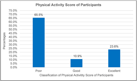 Figure 2 depicts the distribution of habit and lifestyle scores among the participants, showing that 65.5% had poor scores (1–50%), 10.9% had good scores (51–80%), and 23.6% had excellent scores (81–100%). These findings underscore a lack of consistent leisure-time physical activity, which could serve as a compensatory mechanism for limited occupational activity.