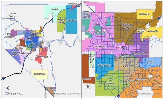 Maps of (a) Clark County and (b) the Las Vegas metropolitan area with the census tracts marked by blue lines.