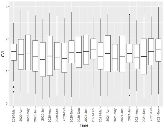 A summary of the CVI related to COVID-19 incidence in Clark County, Nevada, from March 2020 to November 2021. Outliers (dots) were displayed if their CVIs fell outside 1.5 times the interquartile range.