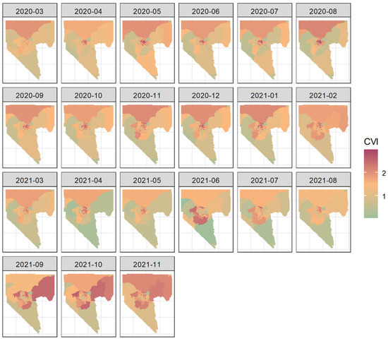 Figure 3 summarizes the CVI by month. The average CVI was between 1.37 (SD = 0.64; July 2020) and 1.67 (SD = 0.44; February 2021), reflecting the variations in the CVI’s spatial distribution. The geospatial distribution of the CVI from March 2020 to November 2021 is shown in Figure 4, indicating that higher CVI values were more likely to appear in census tracts located in northern Clark County and the northeastern Las Vegas metropolitan area. In the second half of 2021, higher-CVI areas expanded to the outskirts of the Las Vegas metropolitan area and northeastern Clark County.