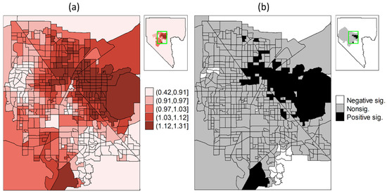 Regarding the association between the CVI and COVID-19 incidence by census tract, the BYM-estimated RRs were between 0.42 (95% CI = 0.28, 0.64) and 1.32 (95% CI = 1.16, 1.49). Higher RRs were observed in the northern and eastern parts of the Las Vegas metropolitan area, while rural census tracts generally had lower RRs (Figure 5a). Among the 535 census tracts, a total of 119 census tracts had significant RRs, including 84 census tracts (15.70%) with significant RRs > 1, all found in the northern and eastern Las Vegas metropolitan area (Figure 5b). In total, 35 census tracts (6.54%) had significant RRs < 1, mostly located in the southern and western outskirts surrounding the Las Vegas metropolitan area.