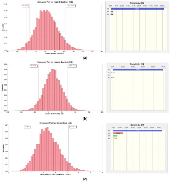 To address the variability for each parameter in the risk assessment, a probabilistic approach was used. We applied ModelRisk (Vose Software version 6.3.2) to simulate the distribution of the risk calculation outputs, i.e., HQ or CR values. The variables used and their distributions are listed in Table 1. It should be noted that AT used in Equation (3) was specific to the South African context and differed by sex, whereas other parameters were retrieved from the EPA Exposure Factors Handbook and our study. All variables were randomly entered into a Monte Carlo simulation with 10,000 iterations. A sensitivity analysis was conducted using Crystal ball software (OCB10BSL-EN) (Oracle, classroom) to identify the parameters that significantly affected the health risk assessment outcome. The simulation outputs are presented using the 50th percentile and 95th percentile values, and a histogram and a sensitivity (tornado) plot are presented for each outcome.