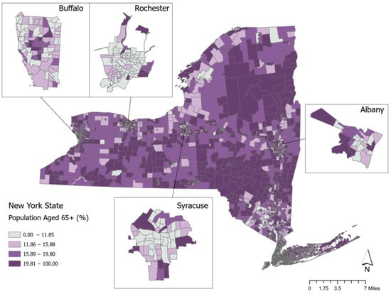 Figure 1 shows the variation across NYS census tracts in the percentage of the population over 65 years of age. The median percentage is 15.89%, and the value at the 75th percentile is 19.81%, which is shaded in the darkest purple category. We consider values at the 75th percentile and higher to be neighborhoods with the highest level of older adult population. Figure 1 shows the distribution of older-adult neighborhoods across the entire state and provides insets of the four largest upstate cities of Buffalo, Rochester, Syracuse, and Albany. The overall NYS map shows that many of the census tracts with the highest levels of population of adults aged 65 and older are in tracts that are located outside of the main metropolitan areas that are in the Catskill and Adirondack Mountain regions as well as in central parts of Western New York in the Finger Lakes region. In the four upstate city maps, the census tracts with the largest shares of older adult populations are located on the outskirts of the cities rather than in the downtown areas.