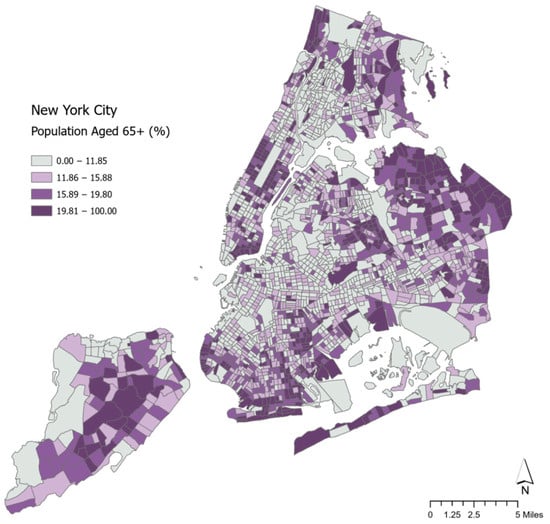 Map of percentage of the population 65 years of age and over in New York City.