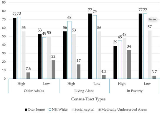 To summarize the key findings of our ecological portrait of census tracts by their older-adult population and further disaggregated by the older-adult population: (a) living alone and (b) by poverty status, we highlight key comparisons in Figure 3.