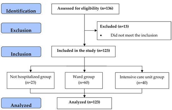 A total of 136 post-COVID-19 symptomatic patients were evaluated at admission to an outpatient Pulmonary Rehabilitation Program (PRP). Of these, three patients had neuromuscular conditions, nine patients were clinically unstable, and one patient had a recent unrecovered musculoskeletal injury that made it impossible for them to perform activities, being excluded from the sample, remaining 123 patients. In the sequence, for the analysis and comparison of the results, the population involved in this study was grouped into three groups. As shown in Figure 1, 23 patients as those who were not hospitalized but developed mild symptoms in the acute period of COVID-19 infection and had persistent symptoms and/or new complaints (not hospitalized [NHG group]). Another group consisted of 60 patients who presented with moderate symptoms and were admitted to a conventional hospital ward (hospitalized in the ward [WHG]), and the third group was 40 patients who developed severe symptoms and needed to be admitted to the ICU due to serious clinical complications (hospitalized in the ICU [ICUG]).