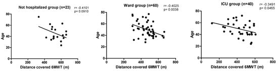 This demonstrated that the group hospitalized in the ICU had a worse physical performance as compared to the group hospitalized in the ward and sequentially to the non-hospitalized group (p < 0.001). The results shown in this present study corroborate the findings of the study by Lombardi et al. (2021), who stratified three groups of patients according to the worst PaO2/FiO2 (p/F) values obtained by arterial blood gas analysis during hospitalization, approximately one month after hospital discharge. The groups were divided into mild (p/F ≥ 300), moderate (≤200 p/F < 300) and severe (p/F < 200). The authors demonstrated that the greater the degree of compromised respiratory functions, the shorter the distance covered in the 6MWT in relation to patients with higher p/F, and were able to observe that patients with mild hypoxemia have lower exercise tolerance when compared to patients with severe hypoxemia (+80.0 m on 6MWT; p = 0.004) [35].