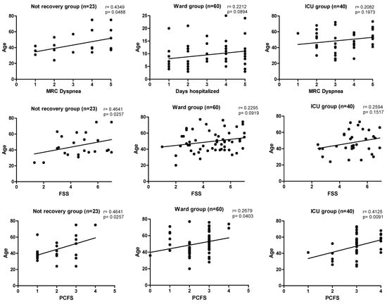 In this study, the main comorbidities prior to COVID-19 infection were SAH, anxiety, and obesity, and these can become risk factors when they present multiple times in the same individual [30]. Several studies have shown that the main risk predictors associated with the severity of complications in infected patients, as well as in those with reduced functional status and HRQoL, were age, male gender, smoking, obesity, need and length of hospitalization, and use and length of mechanical ventilation during ICU stay [30,31,32]. In the present study, negative correlations were also observed between the patients’ ages and the scales and tests applied to assess functional status, such as the 6MWT, the FSS, the MRC dyspnea scale, and the PCFS scale in all groups, except for the WHG MRC dyspnea scale, which showed a positive correlation with the number of days hospitalized. Functional status is defined as a person’s level of autonomy and independence when performing ADLs [33]. The importance of assessing functional capacity in post-COVID-19 patients is highlighted, which can be perfectly carried out through the evaluation of exercise capacity using the 6MWT, considered the gold standard for various populations [34]. In this study, it was possible to observe that in the 6MWT, patients showed a significant difference in the distance covered in meters, 520.42 ± 93.89 (NHG), 450.03 ± 96.43 (WHG), and 420.73 ± 122.78 (ICUG), according to the distribution of the groups (p < 0.001) and in relation to the predicted values for the Brazilian population 87.17 ± 16.00 (NHG), 79.79 ± 13.92 (WHG), and 71.18 ± 18.74 (ICUG).