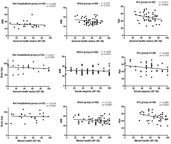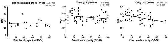 In the present study, the assessment of HRQoL was significant between the groups in the domain ‘limited by physical aspects’, ‘general health status’, and ‘mental health’ (p < 0.05), but it is worth noting that the last two domains mentioned were inversely proportional, demonstrating that hospitalized patients and, consequently, those with a more severe clinical condition, had a better perception of general and mental health, which may be associated with satisfaction of having received proper attention and care necessary for the treatment of COVID-19. In this study, negative correlations were also found between age, weight, and BMI among the three groups in the domains of “functional capacity”, “general health status”, “social aspects”, and “mental health”. A study by Elber et al. (2021) involved 18 patients with COVID-19 who required intensive care, evaluated after hospital discharge at an average of 36, 75.5, 122, and 222 days. The HRQoL measured by the SF-36 showed that the physical component had a greater reduction, improving over time, but when compared to the reference groups, they remained impaired. The most accentuated alterations were in the first moment of evaluation in the domain ‘limitation by physical aspects’ (16.1 ± 31.9) and ‘functional capacity’ (33.3 ± 31.7), which agrees with the findings of this study. When comparing the expected values in healthy people, the domain ‘social aspects’ (60.7 ± 27.2), ‘limitations by emotional aspects’ (58.3 ± 47.4), and ‘general health’ (51.8 ± 13.5) were more compromised [26].