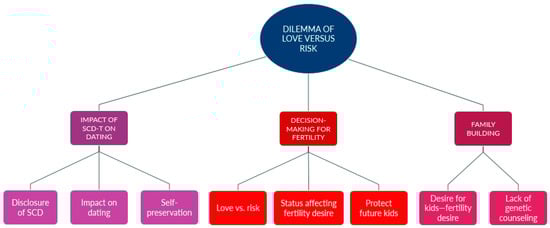 The first theme, the “Dilemma of Love vs. Risk”, captures the profound impact of SCD/T on dating, fertility decisions, and family building choices. Previous studies have noted the lack of family planning information available to young people with SCD and that family planning decision-making is influenced by their partner and/or and the opinions of healthcare providers (HCPs) [17,18]. Women with SCD/T often find themselves at a crossroads, balancing their age-appropriate, “normal” desire for romantic relationships and family formation against the risks posed by their condition. The narratives of the participants vividly illustrate this struggle. This uncertainty, coupled with a lack of support from their providers (and at times even actively dismissive attitudes) about how they would even consider this under their circumstances, complicates their decision-making processes. The accounts from the participants reflect the ongoing tension between the desire for love and the fear of potential health risks. In the current research, participants expressed fear of SCD complications and pregnancy complications, as well as worrying about poor maternal/fetal outcomes, which is similar to the findings in prior research [17].