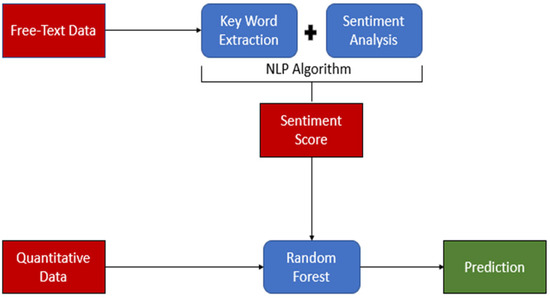 Figure 1. Study flow. The figure illustrates the study flow, highlighting key components using distinct colors: Red represents the data. Blue represents data processing and analysis. Green represents the prediction results. The flow demonstrates the application of Natural Language Processing (NLP) in the study, showcasing the progression from raw data to final predictions.