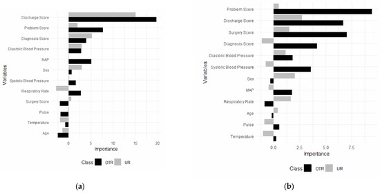 For general surgery, a random forest model was built using 12 predictors, including the diagnosis score, the discharge plan score, diastolic blood pressure, mean arterial pressure (MAP), the problem score, sex, the surgery score, systolic blood pressure, pulse rate, respiratory rate, temperature, and age (Figure 2b). Additionally, the most important predictors in the model to categorize patients for both other admission and unplanned readmissions were identified (Figure 2b).