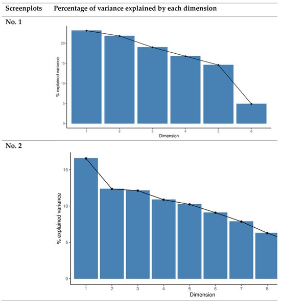 The differences between the two screenplots provide valuable insights. In Screenplot 1, the absence of a clear point of change indicates that the respondents’ verification behaviours were not affected by any specific factor, reflecting a diverse range of influences. Conversely, Screenplot 2 suggests that the first two dimensions play a critical role in capturing the main variations in the data, implying that these dimensions encompass the most relevant factors driving the respondents’ verification practices.