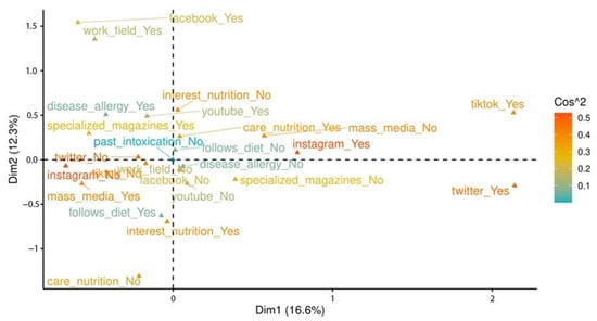 The biplot represented in Figure 2 emphasises the importance of different variables through their squared cosine values, which indicate the contribution of each variable to defining the dimensions. This is because variables with higher squared cosine values are more influential in shaping these dimensions. For instance, if the variable ‘interest in the origin of food’ has a high squared cosine value, this signifies that it is a critical factor in understanding the primary dimension, highlighting its strong association with how the respondents engaged with nutritional information.