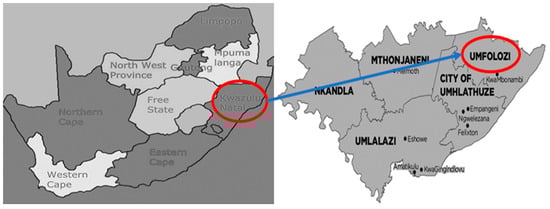 The study was conducted in uMfolozi Local Municipality in Kwa-Zulu Natal, South Africa. uMfolozi Local Municipality is one of the predominantly rural local municipalities in King Cetshwayo District Municipality, that have rural villages led by traditional leaders. uMfolozi Local Municipality has a population of 159,668 [13]. About 23.3% households have access to piped water inside the dwelling, and 26% of the households have access to flush toilets that are connected to sewerage system. The map showing the location of Umfolozi Local Municipality in the province of Kwa-Zulu Natal is presented in Figure 1.