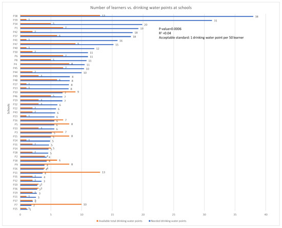 Figure 2 below shows the number of water points versus the number of learners in each school. Blue bars indicate the number of drinking water points that each school must have and orange bars indicate the number of drinking water points that were available in each school. By observing the graph below, a majority of the schools were non-compliant with the acceptable standard of drinking water points (1 drinking water point per 50 learners) [22], and some even surpassed the acceptable standard. This reflects poor planning by the Department of Education as the schools that were supposed to have more drinking water points as required by the standard had fewer and those that were required to have few had more. The relationship between the number of learners vs. drinking water points at the school was assessed using R-squared. The calculation of the R-squared was 0.04, meaning that only 4% of drinking water points are proportional to the number of learners in the school, while 97% of the drinking water points are not proportional to the number of learners in the school. Moreover, the p-value was 0.0006, which means that there is a statistically significant difference between the number of learners in school and the number of drinking points.