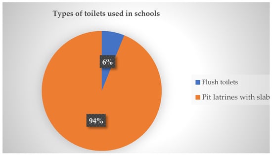 It can be seen in Figure 4 that two types of toilet facilities were used in schools, namely flush and pit toilets. The results further show that pit toilets were used in (n = 46, 94%) schools, whereas flush toilets were used in (n = 3, 6%) schools.