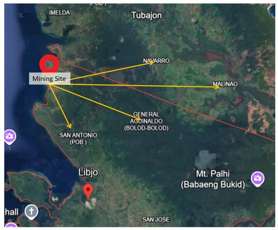 For the study presented, key informant interviews (KIIs) were conducted at the nickel surface mining site and five surrounding communities in the municipalities of Libjo and Tubajon, Province of Dinagat Islands, Philippines. Key informants were identified from the five communities—Brgy. Malinao and Brgy. Navarro in the Municipality of Tubajon, and Brgy. General Aguinaldo and Brgy. San Antonio (Sitio Balite and Sitio Melody) in the Municipality of Libjo—and among the employees at the mining site as shown in Figure 1. Respondents are identified accordingly, and their roles in the community are to explore variations in perceptions of health impacts caused by mining operations.