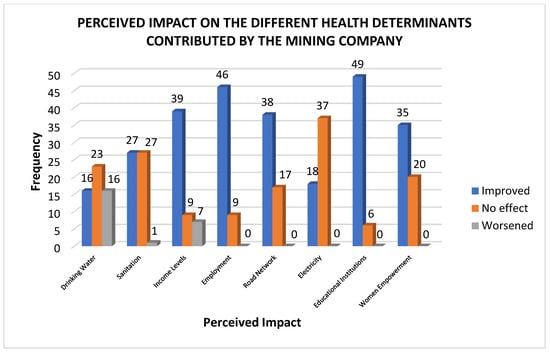 Respondents have also observed a positive change in economic activity due to the mining company’s presence. This is seen in the improved employment and income levels due to the direct work opportunities offered within the mining operations and by the Social Development Management Program (SDMP), along with other secondary economic activities. This result corroborates other studies highlighting the significant influence of the mining sector on economic development and growth [], which in turn allows more resources for social services such as health, education, and welfare, increasing community livability and lifestyle factors [,,,].