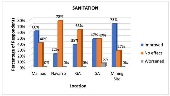 On the other hand, two locations, namely Navarro and General Aguinaldo, generally responded that there was no improvement in this indicator. In contrast, San Antonio responded with an equal percentage of “improved” and “no improvement”. Moreover, it is worth noting that the “worsened” response is generally low across the surveyed area (0–6%), which suggests that the mining company’s provision of toilets and sanitary materials helped improve sanitation across the communities.