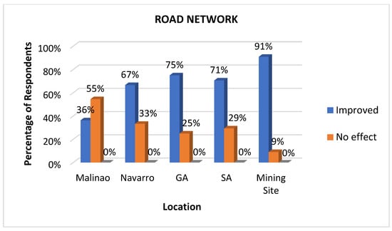 Road networks are an important health determinant because they facilitate access to essential healthcare services, emergency care, and resources needed for well-being. Reliable road infrastructure ensures that residents can reach hospitals, clinics, and other health facilities easily []. Additionally, road networks support the delivery of goods, such as clean water, food, and medicines, while enabling economic opportunities that indirectly contribute to better health outcomes through improved living standards []. This work revealed that as the geographical location draws nearer to the mining site, an increasing trend in the perceived improvement of the road network among the identified locations with the assistance of the mining company is agreed upon by the respondents. As observed in Figure 6, in four locations, namely Navarro, General Aguinaldo, San Antonio, and the mining site, the results show that the majority of the residents agree that there is an improved road network in their area. One respondent stated that: