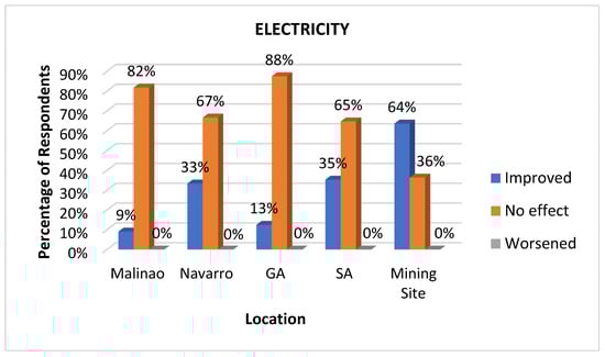 Electricity is an important indicator of health impact because it directly influences the delivery of health services and the functionality of health facilities catering to individual and public health. It is a crucial determinant of health because it also supports the infrastructure required for clean water, food safety, environmental quality, and overall well-being. A lack of access to reliable electricity can result in a deterioration of public health and limited access to essential healthcare services, particularly in rural areas. As anticipated, the mining site workers (64%) had the highest proportion of respondents reporting improved electricity services (Figure 9). Interestingly, the majority of respondents across the area experienced no change in their electricity service, with General Aguinaldo (88%) and Malinao (82%) showing the highest percentages of respondents reporting no effect. Navarro (67%) and SA (65%) also held significantly large majorities stating no change. None of the locations reported a significant worsening of electricity services, with all categories showing 0% except Malinao, where 9% of respondents said that their electricity services had worsened.