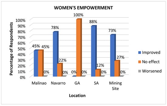Women’s empowerment is a vital health determinant because it enables women to make informed decisions about their health, including reproductive health, nutrition, and access to healthcare services []. In the local context, where women often manage households and care for children, empowering them enables greater investment in their families’ well-being, resulting in healthier children and stronger communities []. Additionally, promoting gender equality and providing women with education, economic opportunities, and social support reduces health disparities and improves overall public health outcomes. Significant improvement responses in women’s empowerment were observed in San Antonio (90%) and the mining site (75%), as revealed in Figure 11. This significant improvement is attributed to the availability of monthly health check-ups and immunizations for pregnant women and the provision of women’s hygiene and sanitary kits. One respondent from Brgy San Antonio stated: