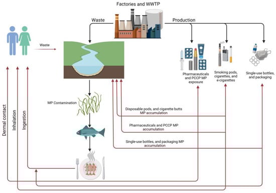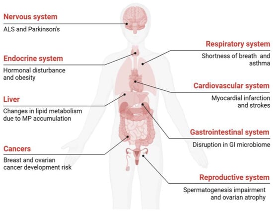 MPs have emerged as a significant concern for human health, with growing evidence suggesting their potential to induce gut microbiome disturbance, gastrointestinal disorders, cardiovascular diseases, and endocrine disruption. Studies indicate that MP accumulation can damage the blood–brain barrier (BBB), triggering inflammatory responses and oxidative stress in neural tissues, which may contribute to conditions such as Alzheimer’s and Parkinson’s diseases. Furthermore, the accumulation of MPs in the brain has been linked to the disruption of neuronal function, microglia activation, and the promotion of neurotoxicity, highlighting the urgent need for further research into their long-term neurological impacts [].