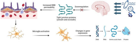 Alterations in the gut microbiome and hormonal disturbance are the main factors behind blood–brain barrier (BBB) damage. The BBB is a critical barrier that protects the brain from peripheral toxins and pathogens. As shown in Figure 3, MPs accumulate in brain tissue because they downregulate tight junction proteins, such as zonulin and occludin, leading to increased BBB permeability []. This effect has been observed in key brain regions, including the cortex, hypothalamus, and hippocampus, making the brain more vulnerable to systemic inflammation and circulating toxins. In vivo studies, including those using chicken models, have revealed structural damage in the brain, such as intracerebral hemorrhage, associated with MP exposure. This structural damage is often accompanied by mitochondrial dysfunction, a critical factor in maintaining cellular energy homeostasis. Mitochondrial damage increases the production of ROS, exacerbating oxidative stress and amplifying neuronal damage [,]. Furthermore, PS has been internalized by human cerebral microvascular endothelial cells (hCMEC/D3), which are widely used as models to study human BBB function. These cells exhibit altered surface properties and impaired functionality following PS exposure, validating the neurotoxic potential of MPs in human systems [].