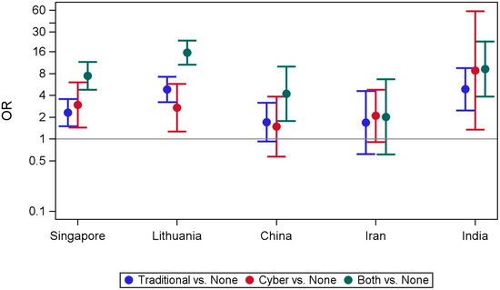 Table 3 presents the result of univariate and multivariate analyses examining the association between suicide attempt and bullying victimization by country. Figure 1 illustrates the results of the multivariate analysis adjusted for the age and gender of participants. In India, Lithuania, and Singapore, all three categories of victimization (traditional only, cyber only, combined) were associated with significantly higher odds for suicide attempt and the highest odds were in Lithuania for combined victimization (OR 15.61, 95% CI 10.61–22.94). In China, combined victimization was significantly associated with suicide attempt (OR 4.22, 95% CI 1.77–10.02) but not traditional victimization only and cyber victimization only. There was no significant association in Iran with all three categories of victimization.