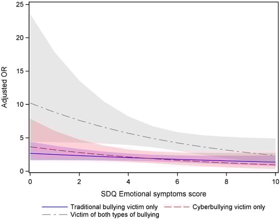 Adjusted Odds Ratio of suicide attempt and their 95% confidence intervals by victimization type and emotional score adjusted for country, age, and gender. Colored shadows represent confidence interval for each victimization type. The reference category was no bullying victimization.