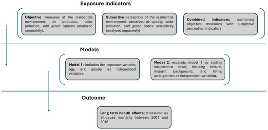 First, we assessed the association between each objective indicator (one at a time) and all-cause mortality. Second, we assessed the association between each subjective indicator (one at a time) and all-cause mortality. Finally, we used the combined indicator (objective + subjective) for each environmental dimension to assess the association with all-cause mortality. For each model, we specified a basic model M1 (including the exposure indicator, age and gender) and a fully adjusted model M2 (additionally adjusting for educational level, housing tenure, migrant background and household living arrangement). This workflow is also shown in Figure 1.