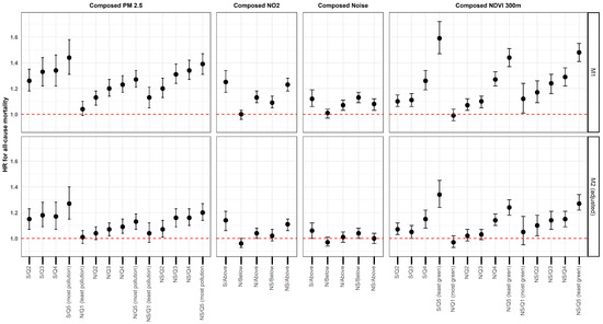 Overall, three general patterns emerged. Unexpectedly, individuals who reported being satisfied with their living environment appeared to be more strongly affected by poorer environmental conditions (such as higher levels of air pollution, greater noise pollution or less surrounding greenness). Specifically, the group that combined a satisfied subjective perception with the least favourable objective conditions had the highest hazard ratios for each exposure. For example, individuals in this category showed a hazard ratio of 1.34 [1.24; −1.45] for surrounding greenness.