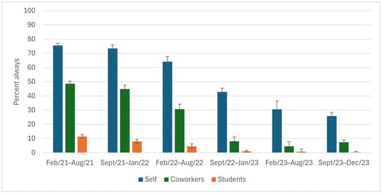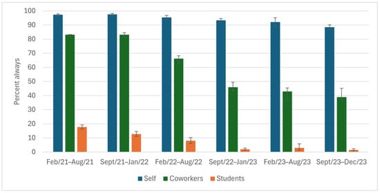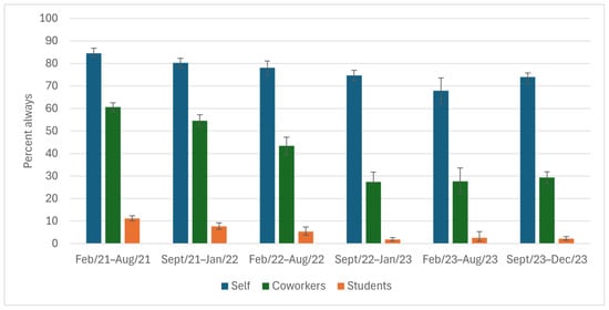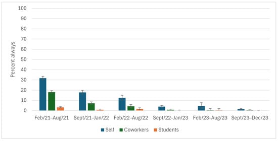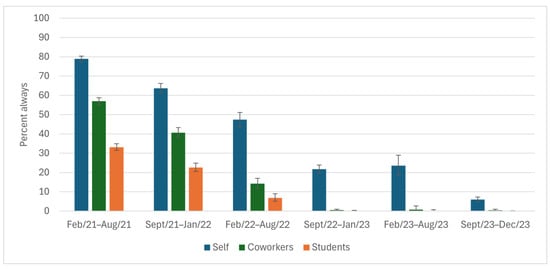 “I have noticed an uptick in students who are off sick returning and wearing a mask for a few days after their return... the same goes for staff members... I am not currently masking, though I plan to begin again during cold and flu season, especially before I receive my flu shot.”(Teacher, secondary school, September 2023)